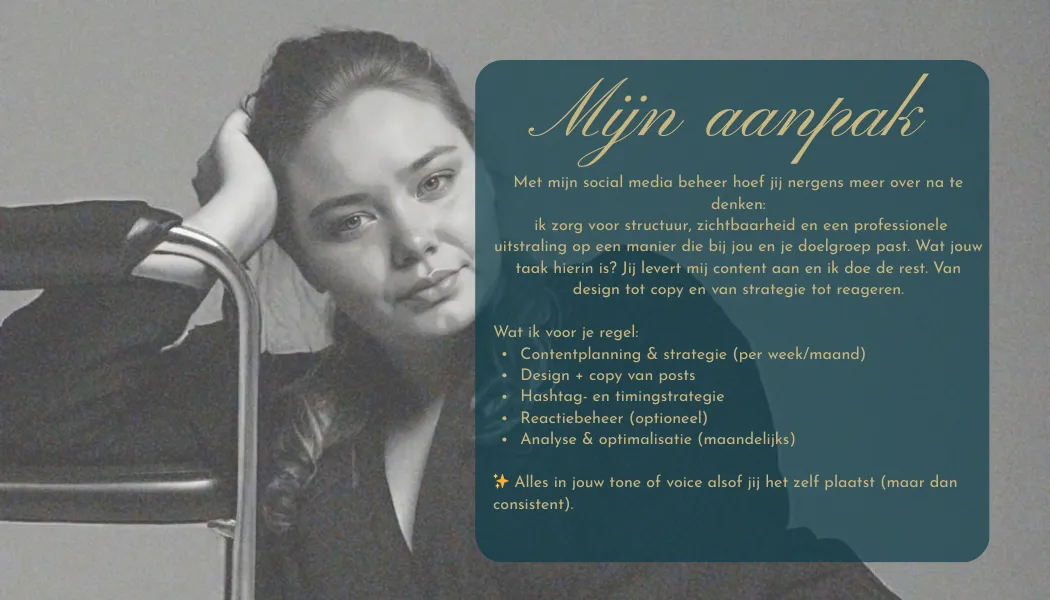 Laat jouw social media voor je werken zonder stress. Ik beheer jouw Instagram, Facebook of LinkedIn met content die opvalt, betrokkenheid opbouwt én klanten aantrekt.